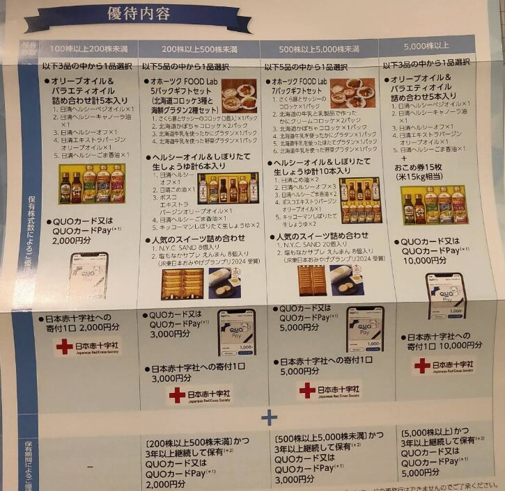 | 100株以上 | ①、②2,000円分、③2,000円分 の中から1品選択 |