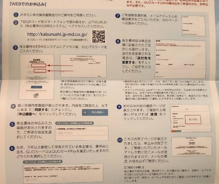 申し込みはQRコードを読み込み、IDは株主番号、PWは郵便番号で簡単にログインできます。