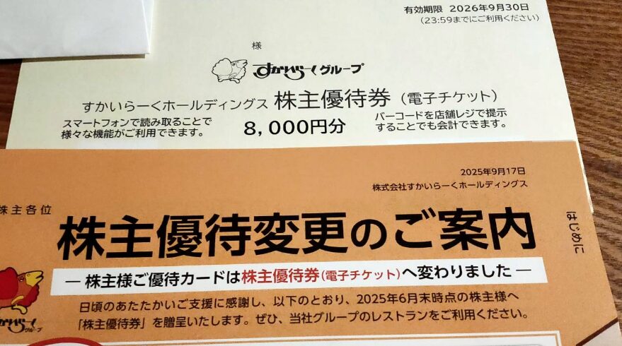 株主優待変更のご案内が入っており、以前はカード型優待券でしたが今年からは電子チケットになっています。