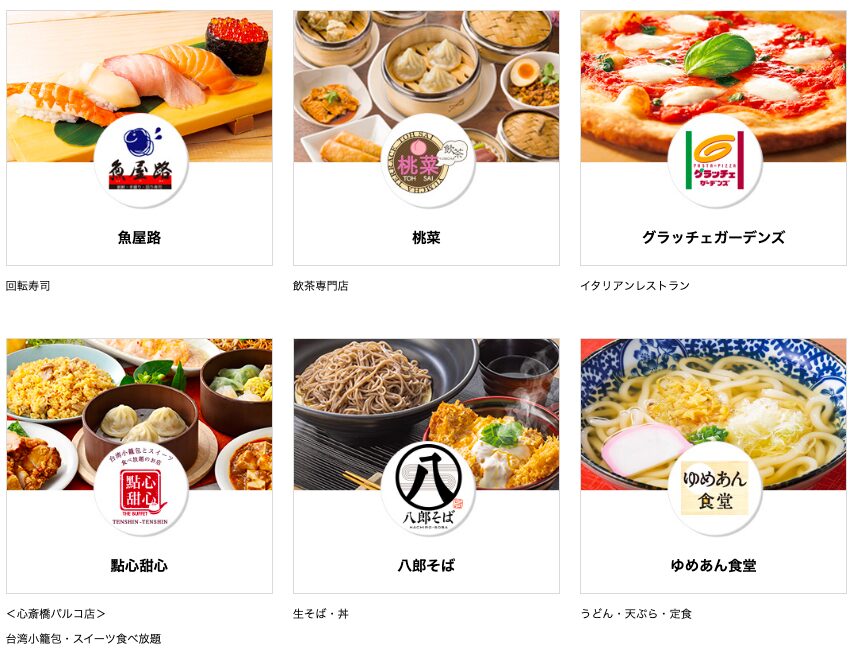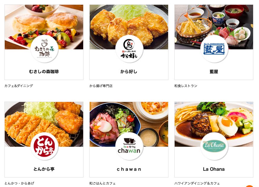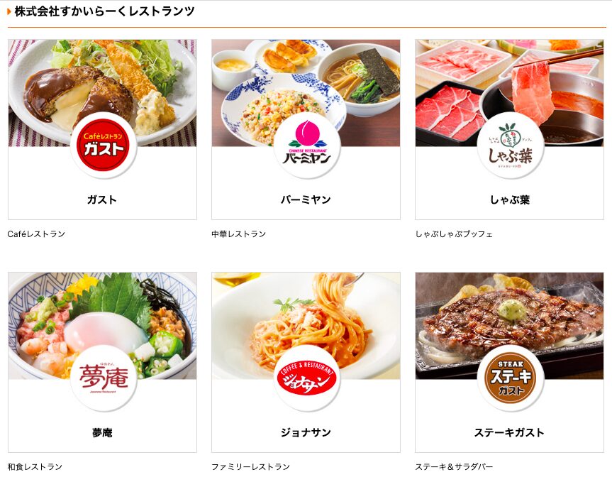 使える店舗は多岐に渡りますがガスト、バーミヤン、しゃぶ葉、ジョナサン、ステーキガストあたりが有名です。むしろそれ以外は行ったことがありません。