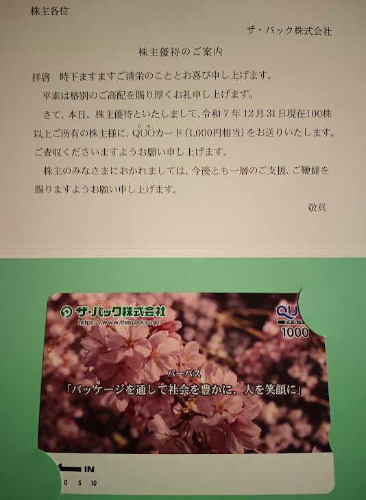 12月3950ザ・パックから12月優待のQuoカード1000円が到着しました。