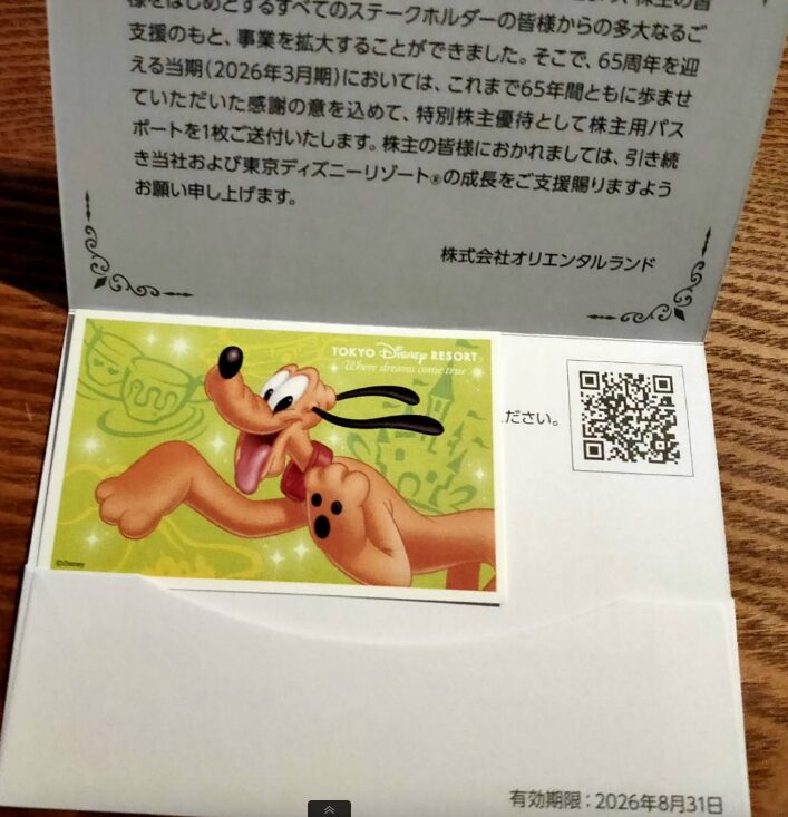 通常でしたら3月に500株以上、または9月に100株以上を3年以上保有した株主にしかもらえない1デイパスポートをいただきました。