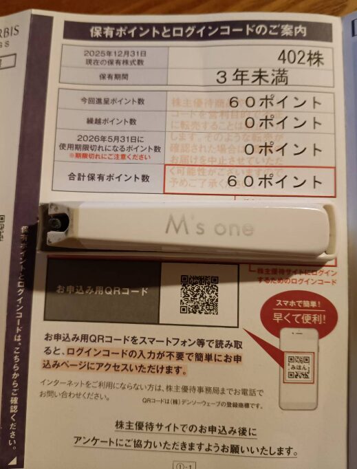 今回は400株の1年以上、3年未満なので60ポイントです。