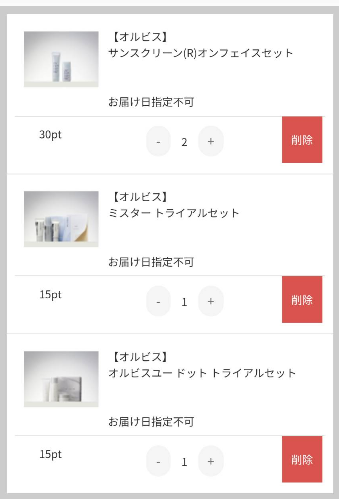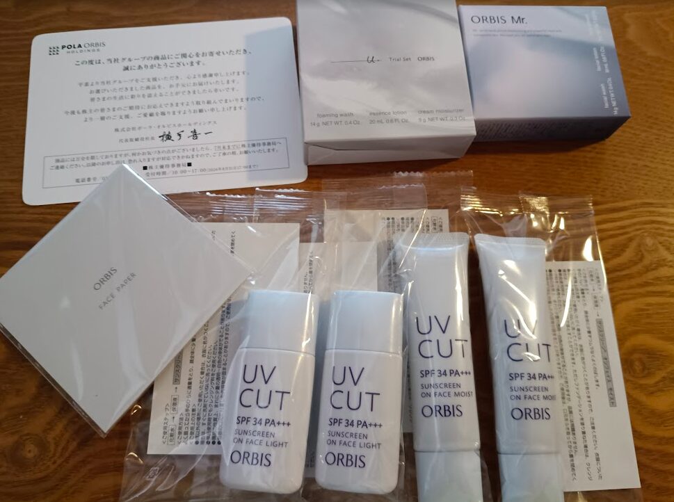 これから日差しがキツくなる日々が増えてきそうなので日焼け止めクリームx2個、男性用の化粧水、乳液等のミスタートライアルセットを1つ、オルビスユー ドット トライアルセットを1つです。