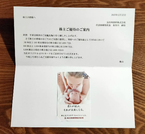 12月22日、4958長谷川香料から9月優待のQuoカード1000円分が到着しました。