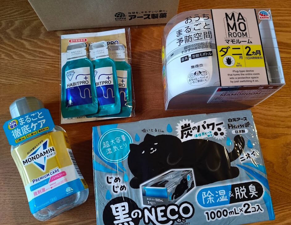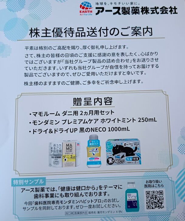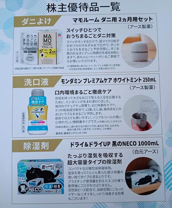 優待商品はマモルーニ ダニ用、モンダミン、ドライ&ドライU P黒のNECOの3点とモンダミンハミットの試供品3袋です。内容にはまずまず満足です。