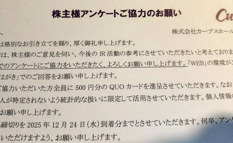 しかも同封の株主アンケートに回答すると500円分のQuoカードが全員にもらえる太っ腹。