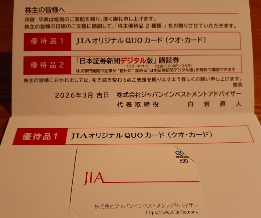 7172ジャパンインベストメントアドバイザーから12月優待のQuoカードが到着しました。