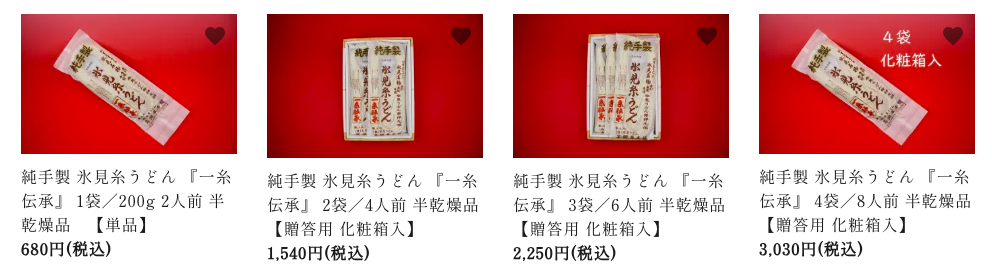 Eコースの高岡屋本舗の「氷見糸うどん」はHPを見ると1000円相当の価格が見つからず、この中ですと1袋(680円)になるのかもしれません。ちょっと物足りないですね。