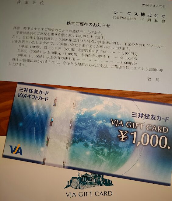 7613シークスから12月優待のギフトカード1000円分が到着しました。