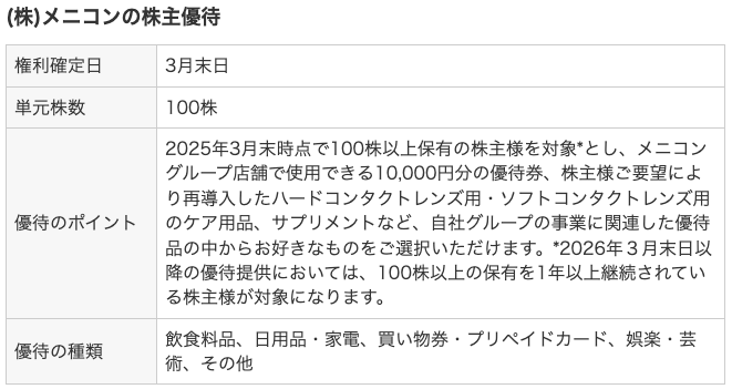 コンタクトレンズ・ケア事業 | 株主優待券 | メニコン優待券※ 10,000円分(1,000円×10枚) | A |
