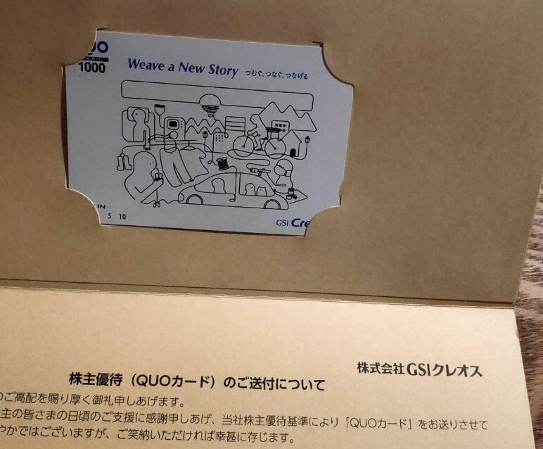 12月12日、8101GSIクレオスから9月優待のQuoカード1000円分が到着しました。