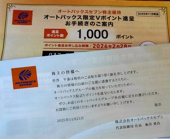 オートバックスの優待は保有1年以上でもらえるのですが既に1年以上前から1株を保有しており、今年9月に初めてクロス取引をしました。そして今回優待が到着です。