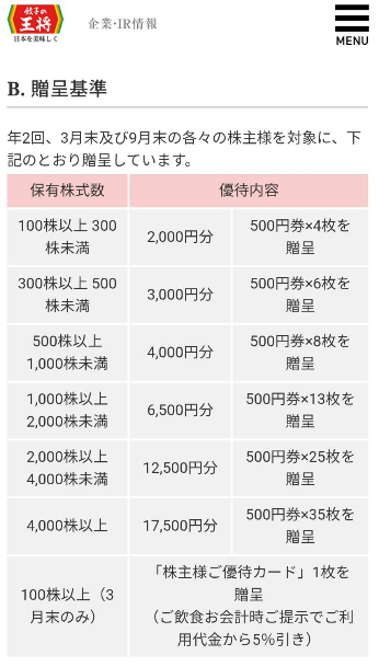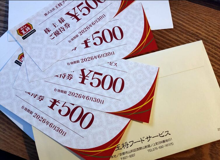 王将の株主優待券は、店頭で500円の金券として使用できます。