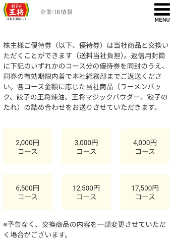 また優待券は返信用封筒に優待券を入れて送り返すことでその優待金額相当の王将商品に交換することもできるようです。