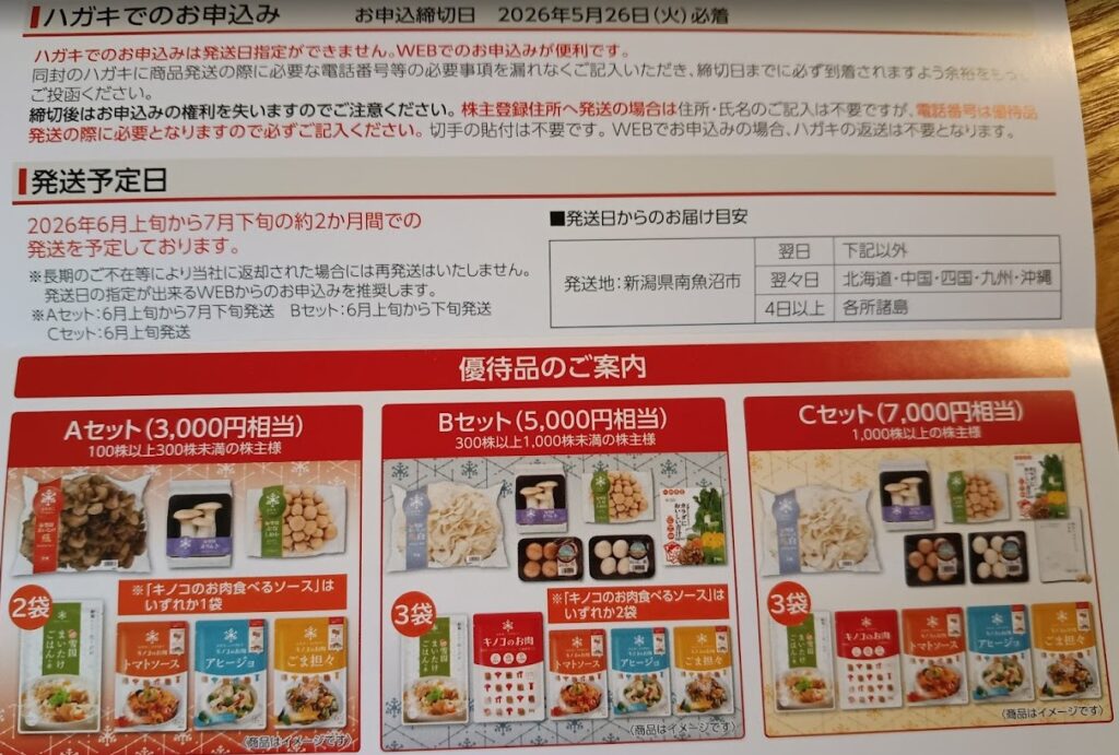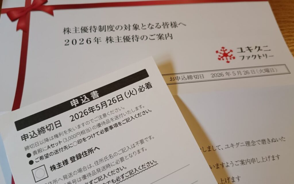 【株主優待】1375ユキグニファクトリー 3月 2026.04.30 1375ユキグニファクトリーから3月優待の案内が届きました。100株で3000円相当のきのこセットがいただけます。 優待をいただくには半年以上の保有が必要なため、現物で100株保有していました。3月末の3月27日に売りを入れてクロス取引にして権利落ち日に現渡しています。 目次 株主優待の内容自社製品セット 株主優待の内容 自社製品セット 継続保有6ヶ月以上 100株以上3,000円相当300株以上5,000円相当1,000株以上7,000円相当