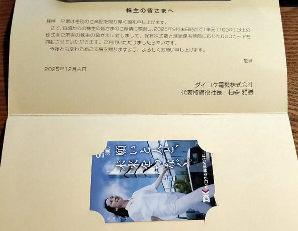 12月8日、6430ダイコク電機から9月優待のQuoカード3000円が到着しました。