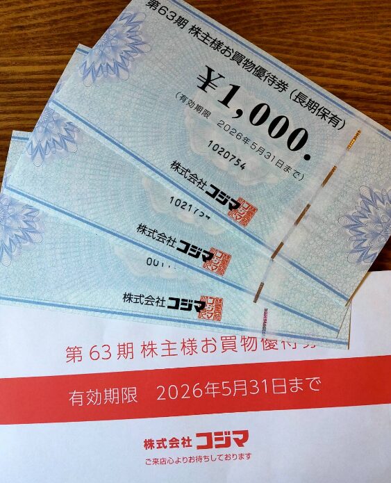 11月27日、7513コジマから8月優待の優待券3000円分が到着しました。