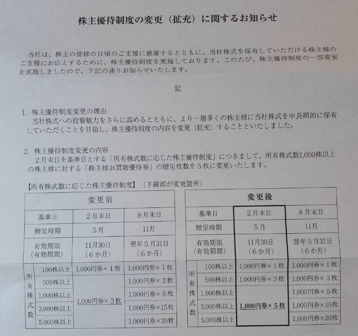 なお、2026年2月の優待から変更があり、1000株以上の場合は優待券3枚から5枚に拡充となるそうです。100株、500株は変わりませんので関係なさそうです。