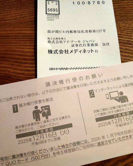 2370メディネットから決議権を行使したら500円のQuoカードを進呈するとの案内がきました。
