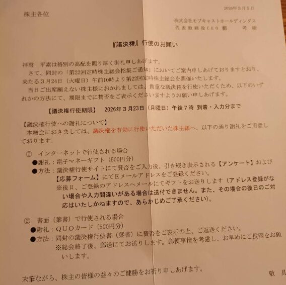 12月権利日の3664モブキャストホールディングスから決議権の案内がありました。