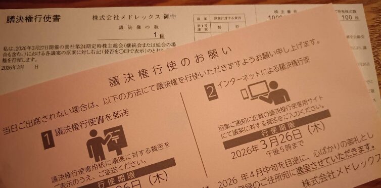 【隠れ優待】4586メドレックス 12月 2026.03.15 4586メドレックスから議決権の案内がありました。隠れ優待目当てで現物を購入した銘柄です。12月の権利落ち日は−100円で売ってますので+400円の予定です。