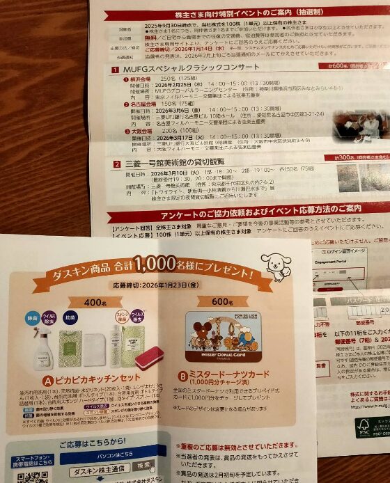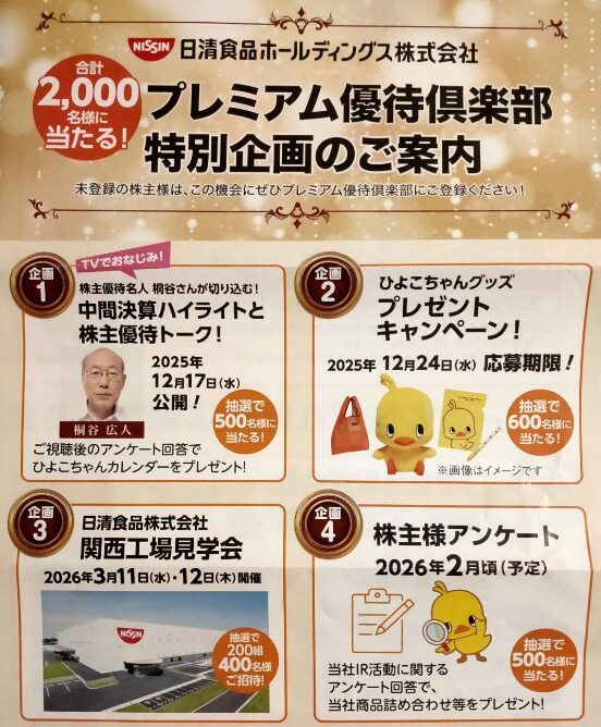 8306三菱UFJフィナンシャル・グループはクラシックコンサート視聴、4665ダスキンはプレゼント、2897日清食品ホールディングスは工場見学抽選やアンケート回答でプレゼント抽選を行ってます。どれくらいの当選率等はわかりませんが可能性はあるので興味のあるものは応募するようにしています。