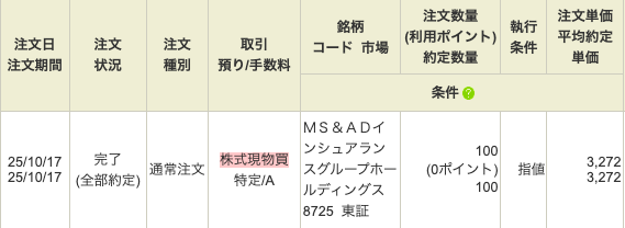 月曜日がどうなるかは神の味噌汁ですが、前回200株のうち100株売却した8725MS&ADインシュアランスグループホールディングスが少しマイナスぐらいになっていましたので反発を期待して100株購入しました。