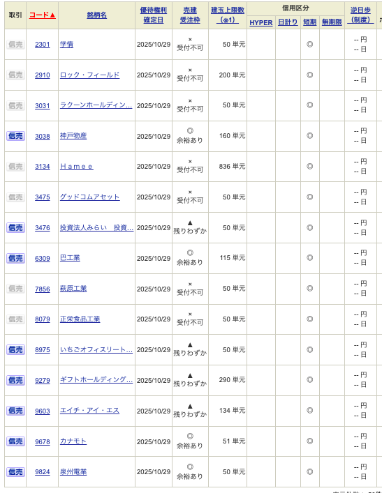 SBI証券でも今日から信用短期(15日)でクロス可能ですが2301学情、2910ロックフィールドなどの人気銘柄は残ってません。10月優待は諦めて11月、12月の良い優待をSMBC証券で狙っていく方がいいかもしれません。
