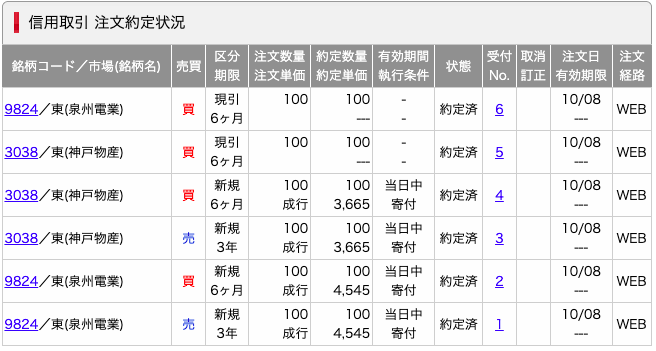 クロスの手数料が安いSMBC証券で10月優待狙いで9824泉州電業、3038神戸物産をクロス取引しました。クロス取引約定後、すぐに信用買の分は現引して現物保有にしています。