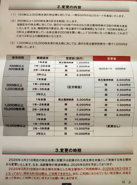 上記の変更後の内容では100株はQuoカード500円分に、その代わり、300株以上が新設されて、1年未満の3000円から3年以上で7500円まで株主優待特典の金額が成長します。