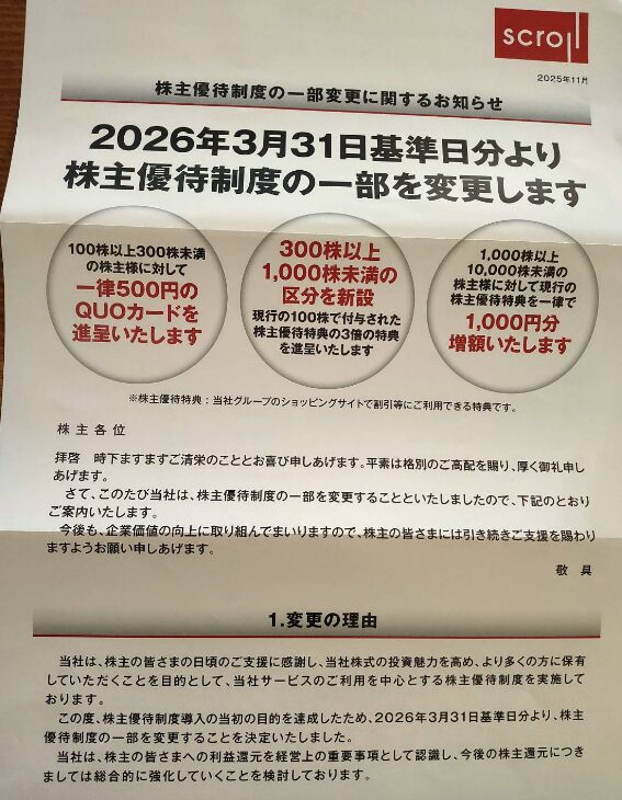 しかし、今回株主優待制度の一部変更の案内がありました。