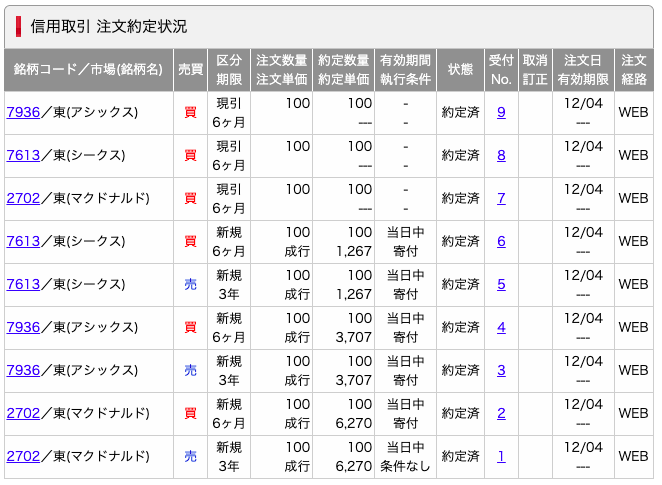 SMBC証券で12月優待狙いで7613シークス、7936アシックス、2702マクドナルドホールディングスをクロス取引しました。