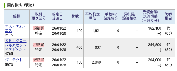2175エス・テム・エス、4765 SBIグローバルアセットマネジメント、5970ジーテクを購入しました。