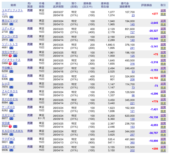 3月28日は土曜日で売買はありませんがクロスした信用建銘柄を現渡します。
