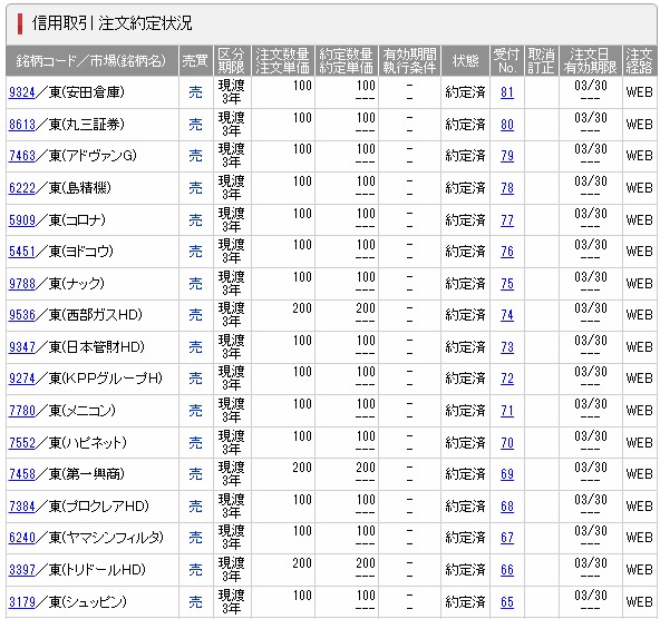 全て現渡です。信用取引の一覧に何も残っていないのを確認します。