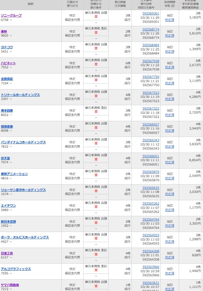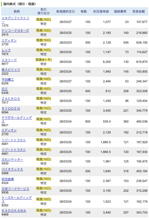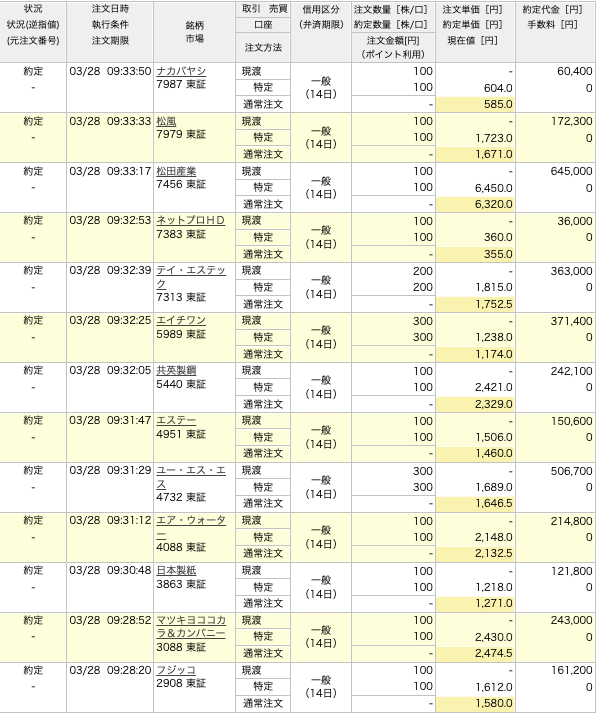 3月28日の売買です。今日の取引は3月優待の現渡がメインです。