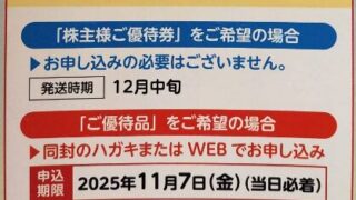 8月 【株主優待】【クロス】3222ユナイテッド・スーパーマーケット・ホールディングス 10月20日に3222ユナイテッド・スーパーマーケット・ホールディングスから8月優待が到着しました。こちらの優待は優待品が欲しい場合はハガキまたはWebから申し込みを行います。株主優待券3000円分の方が欲しい場合は何もせずにいれば12月に... 2025.10.22 8月クロス取引投資株主優待